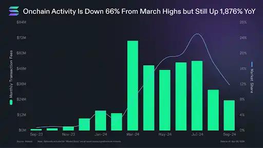 In terms of transaction fees, Solana has made significant progress. Prior to December 2023, Solana's monthly transaction fee market share never exceeded 1.5%. Since April 2024, this ratio has consistently remained above 10% and reached a peak of 25% in July. When we consider MEV tips to measure "Real Economic Value" (REV), Solana is closing the gap! The chart from blockworksres highlights the narrowing gap in REV between Solana and Ethereum.