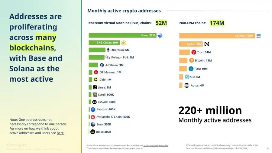 The author frames the world as a dichotomy between EVM and non-EVM, creating a binary opposition that views ecosystems and developers who do not choose to build within the EVM as the "other." For example, the visualization of active addresses is misleading. Solana reaches 100 million monthly active addresses, surpassing Base's 22 million, yet the chart almost equates the two. A more accurate approach would be to use a single bar chart, differentiating the EVM and non-EVM bars with different colors (if necessary). Additionally, the slide claims that "Base and Solana" have the highest monthly active addresses, but a careful reader will notice that NEARProtocol has 31 million active addresses, surpassing Base. Therefore, the title should be changed to "...Solana and Near are the most active."