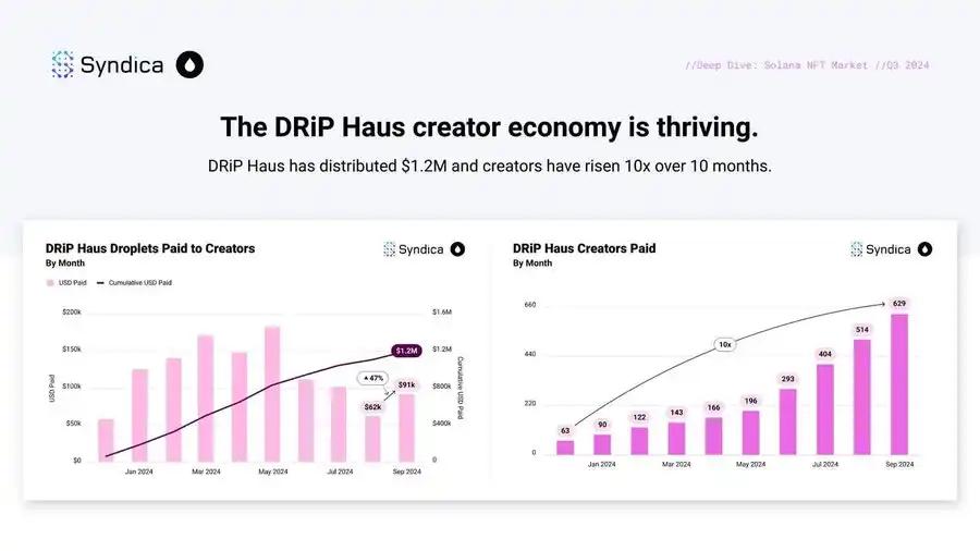The slide mentions that low transaction costs drive new consumer behaviors, which can be well illustrated by the example of drip haus. Since March 2023, the platform has achieved 182 million Non-Fungible Token mints at a total cost of only 1,600 SOL (at a SOL price of $150, each Non-Fungible Token costs only $0.001), as pointed out by ledger top.