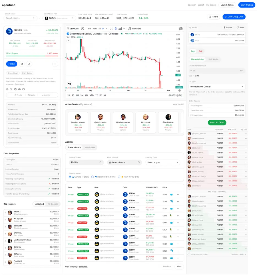 But this is just the beginning. We will also be increasing the liquidity in BTC, ETH, SOL and OPENFUND markets before the launch of Focus. This will make trading on Openfund competitive with any CEX for these currency pairs, with the added benefit of being fully self-custodial (not to mention the near gas-free transfers supporting all these cross-chain assets). In short, Openfund will provide all the best qualities of a CEX, plus all the best qualities of a DEX. Many have asked about trading fees. Currently, Openfund allows zero-fee trading. However, when we launch Focus, fees across all markets will increase to 10 basis points, 100% of which will be used for $OPENFUND buyback and burn (pending on-chain voting). This will provide Openfund with a revenue stream while keeping it competitive with all CEXs. Importantly, these revenues will come not just from the major markets like DESO, BTC, ETH and SOL, but from every DeSo token that users list on Focus.