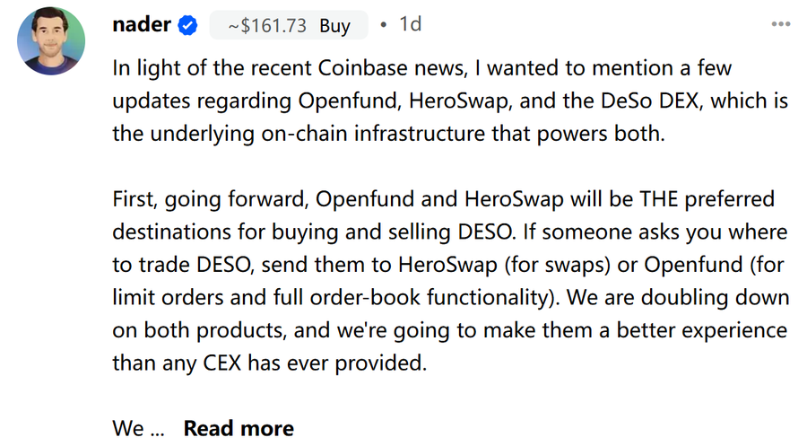 Due to this Coinbase news, DESO founder Nader has released updates on Openfund, HeroSwap and the DeSo DEX, which is the underlying on-chain infrastructure that supports both.