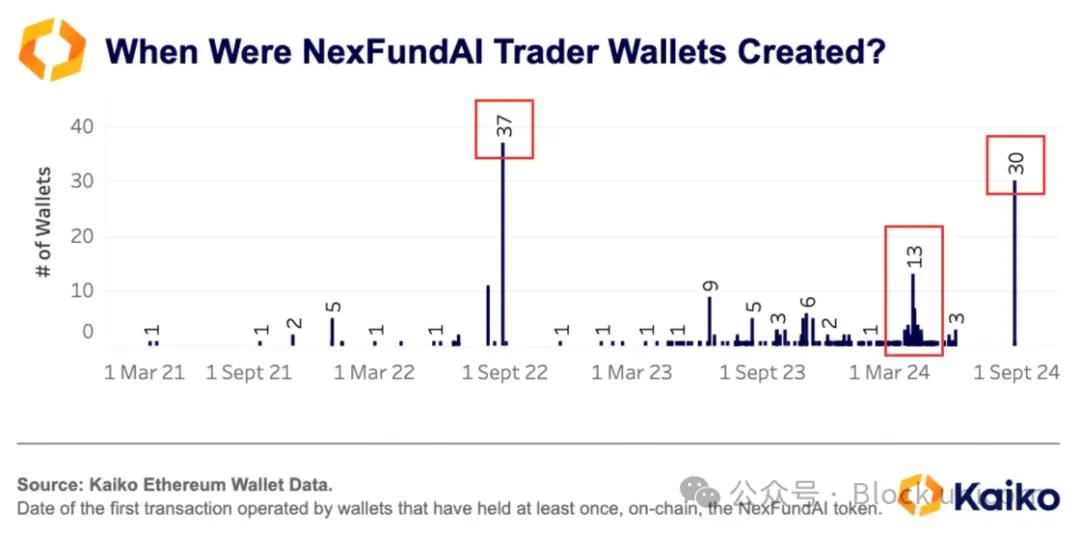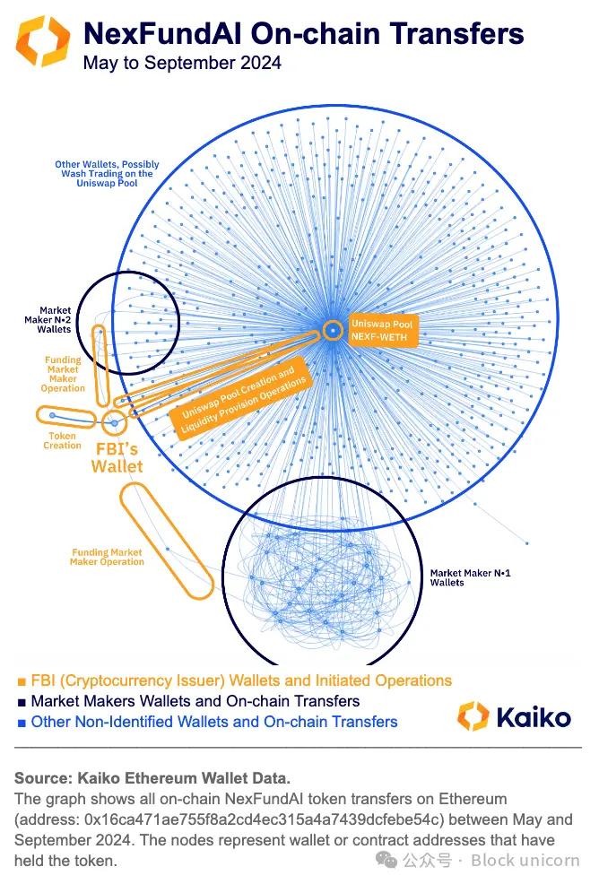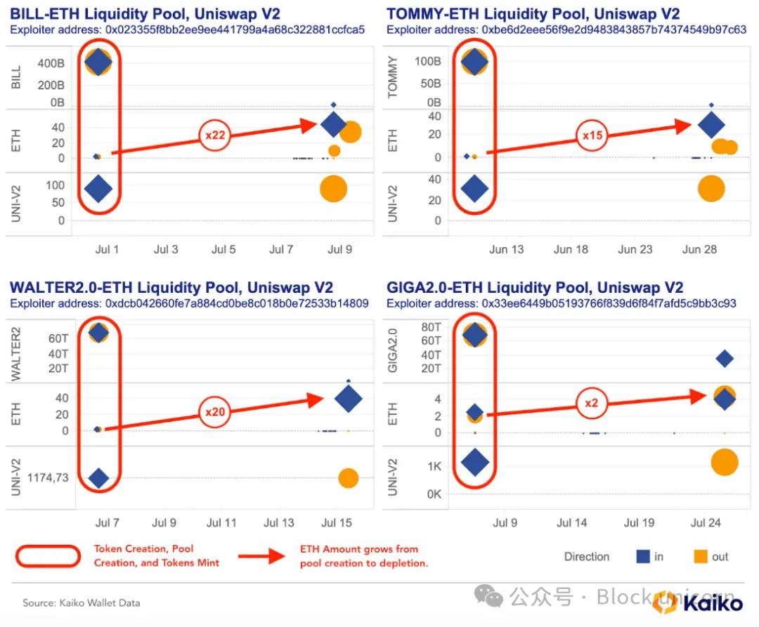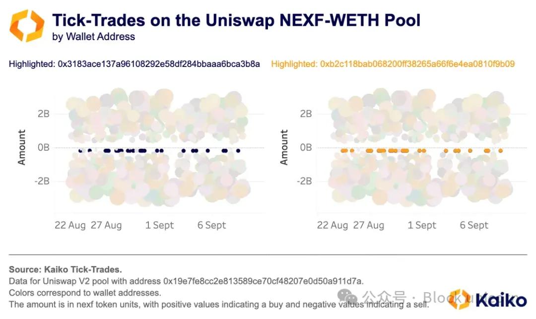 Some token issuers who launch tokens on Ethereum will set up short-term liquidity pools on Uniswap. By controlling the liquidity in the pool and using multiple wallets to conduct wash trading, they enhance the pool's attractiveness, drawing in retail investors, accumulating ETH, and then dumping their token holdings. According to Kaiko's Wallet Data analysis on four cryptocurrencies, this operation can achieve a 22x return on the initial ETH investment in about 10 days. This analysis reveals widespread fraud among token issuers, going beyond the FBI's investigation of NexFundAI.