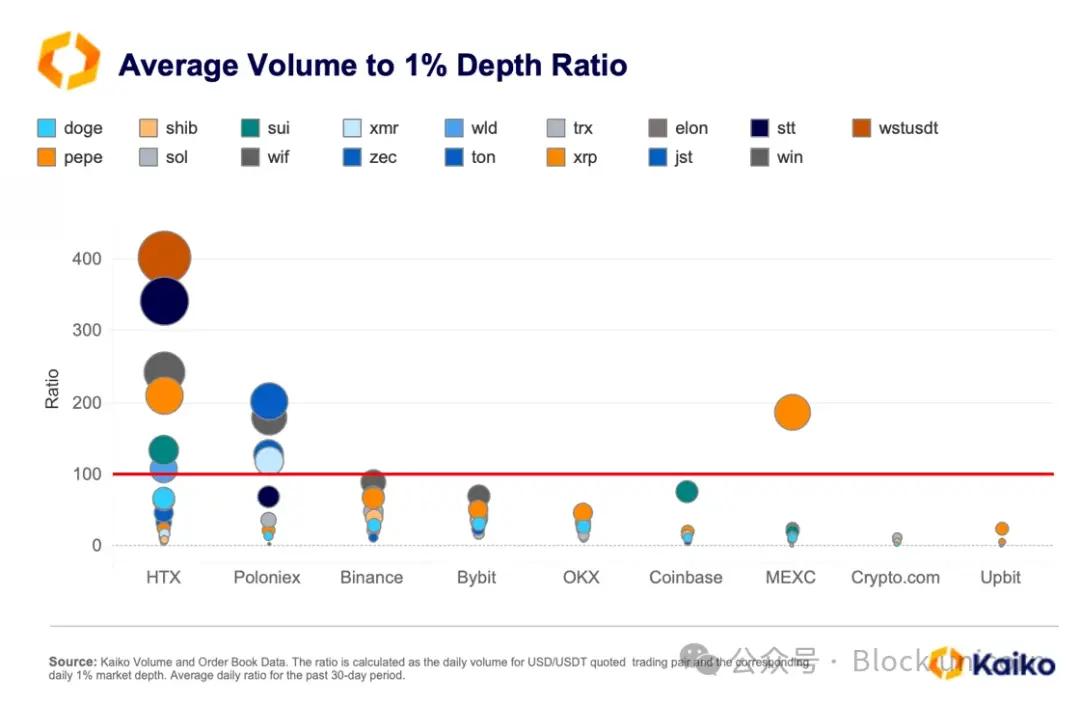 The data shows that assets with a trading volume-liquidity ratio over 100 times are the most prevalent on HTX and Poloniex. Typically, meme coins, privacy coins, and low-cap Altcoins exhibit abnormally high trading volume-depth ratios.