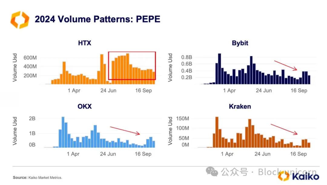 For example, when we look at the PEPE token on certain exchanges, we find that HTX's trading volume trend in 2024 differs significantly from other platforms. On HTX, the PEPE trading volume remained high and even increased during the July period, while on most other exchanges, the trading volume declined.