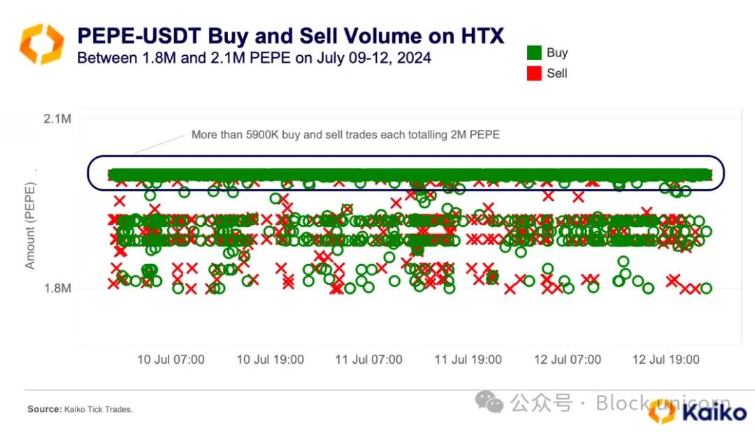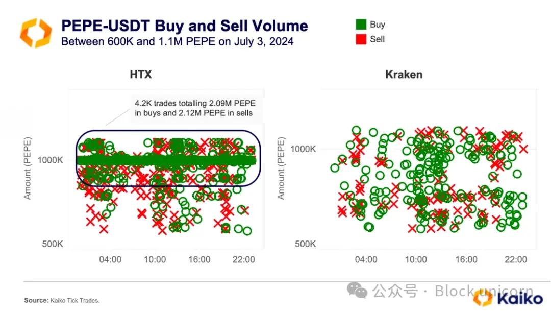 Further analysis of the trade data shows that there is active algorithmic trading activity in the PEPE-USDT market on HTX. On July 3, there were 4,200 buy and sell orders of 1M PEPE, averaging about 180 orders per hour. This trading pattern contrasts sharply with the more natural and retail-driven trading on Kraken during the same period, where the trade sizes and timing are more irregular.