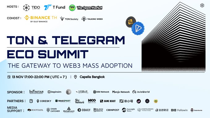 ☢️TIDO CAPITAL · Produce 📩TON & Telegram ECO Summit✈️ 🗓Date: Nov 13th, 17:00-22:00 📍Address: Capella Hotel Bangkok 🎙Host by Tido Capital, T Fund and The Open Market. with full support from TON Society, Binance TH, TalkingWeb3, Blum and BBQCOIN. @TFund_official