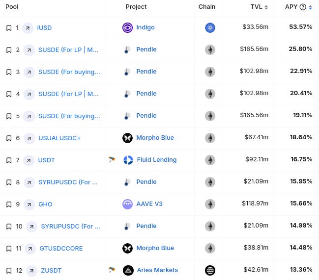 (note: these are the top Stablecoin Yields, sourced from @DefiLlama (single-exposure, no-IL, $20M+ TVL only) - note: these lists are just raw data, make sure to always DYOR before interacting with any/all protocols)
