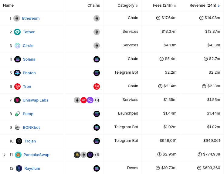 Here’s The Top 12 Entities By 24 Hour Revenue Generation (from @DefiLlama):