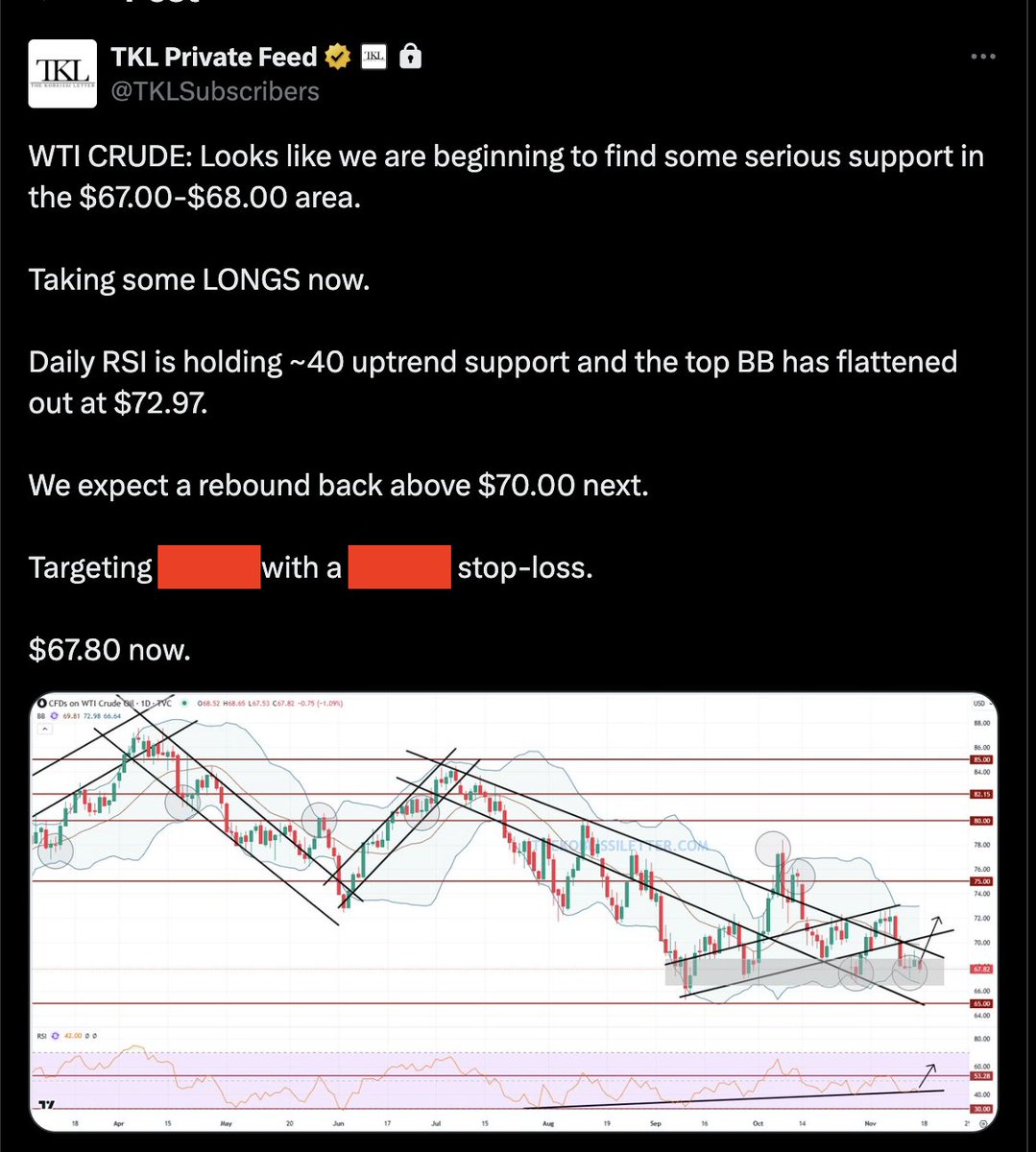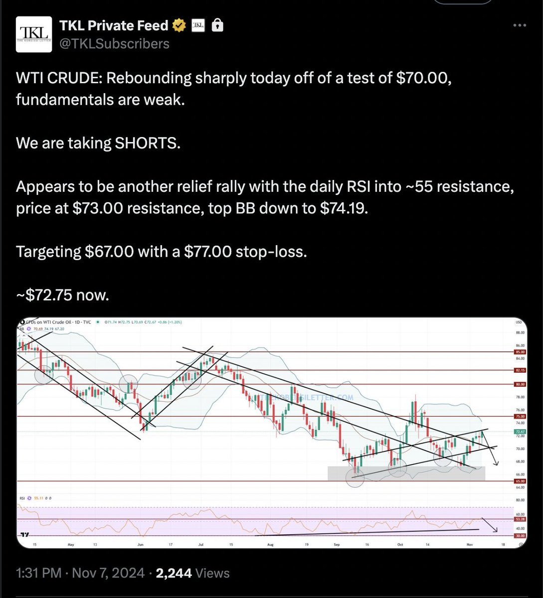 We first took shorts at $72.75 down to $67.00, then longs last Friday and called for $70.00+.