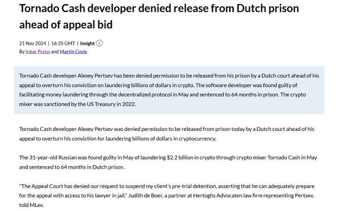 Just out: Dutch court denies Tornado Cash dev Alexey Pertsev's second bid to get out of prison ahead of his appeal trial since he was found guilty in May.