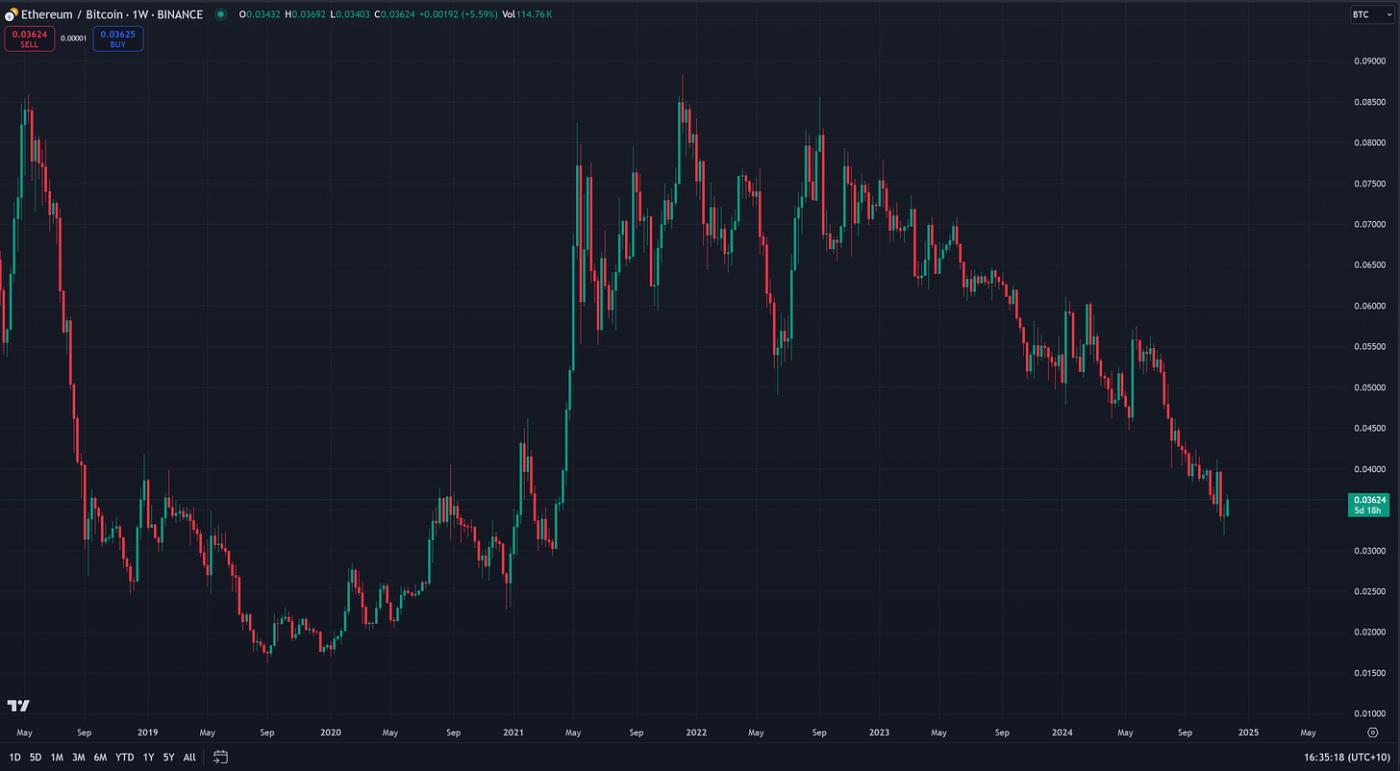 This is the ETHBTC chart over the last 5ish years. Clearly it hasn’t been a good couple of years for ETH! But anyone who knows anything about charts, markets, and investing, will tell you that you want to buy at times like this, not sell.