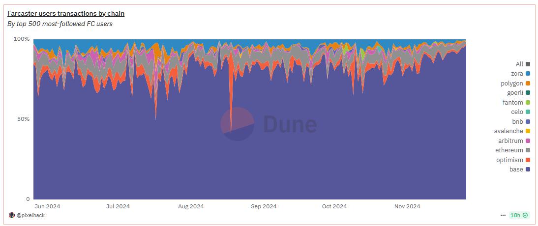 Base and Farcaster very much go hand in hand. While many chains are supported and used via Farcaster, Base is basically eating the world atm. You can see by this chart that for most of the year Base has made up between 60-80% of all onchain transactions from Farcaster users, but in recent days that number is hitting 95%+.