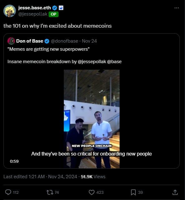 Before we dig in though, it’s worth stating the obvious that most of what is covered in this newsletter + most of what exists in crypto atm (especially wrt memecoins) is insanely risky, a huge bubble, and damn near everything WILL crash 95-100% from here. I am trying to trade this market like everyone, and I will be trying to sell my bags when I think things have hit blow off top levels, and will take profits on the way up there. I’ve already taken a bunch of profits.
