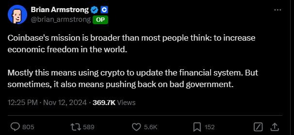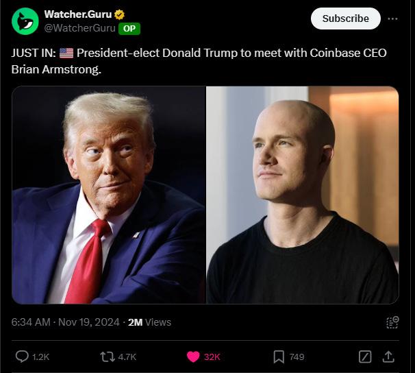 Brian Armstrong casually meeting with Trump to discuss crypto policy. Brian is an absolute boss of a person btw, read this post from 2020 (yes, sorry, here I am asking you to read more stuff again) and try and think back to what the world was like then and what most large tech companies were doing in terms of taking political stances, and how monstrously different the approach Brian took with Coinbase was.