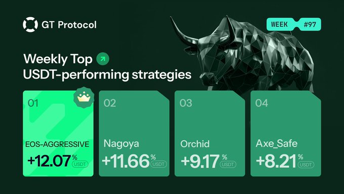 🏆 GT Protocol’s Weekly Top Performers Curious about the strategies that shined the brightest last week? Here are the standout results: 1️⃣ EOS-AGGRESSIVE: Secured a remarkable +12.07% USDT growth 2️⃣ Nagoya: Generated an impressive +11.66% USDT return 3️⃣ Orchid: Reached a solid