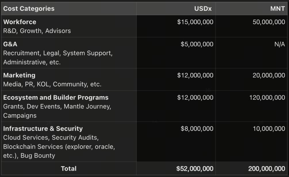 The Mantle Core Budget is the primary expense for $MNT and is used for payments and incentives for: labor, general and administrative expenses, marketing, ecosystem and builder programs, and infrastructure and security.