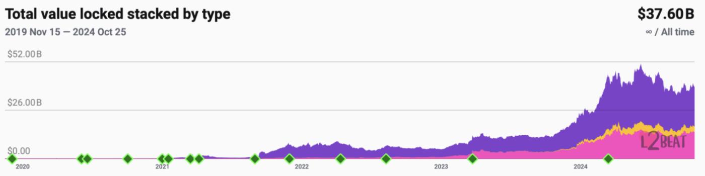 It is in this context that the current L2 track is booming. According to L2 Beat data, there are already 110 L2 or L3 expansion solutions in operation on the market, however, only a few L2s can gain mainstream recognition and generate a large number of TVL and users. As of October 24, 2024, the TVL of L2 expansion solutions has reached US$37.62 billion, a three-fold increase from a year ago, showing strong development momentum and user demand.