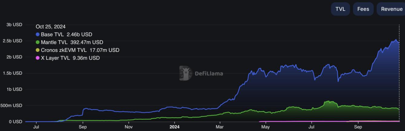 From the perspective of TVL comparison, Base is relatively leading, Mantle ranks second, and Cronos zkEVM and X Layer are still on a smaller scale.