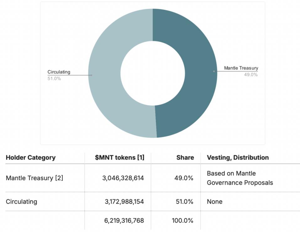 As can be seen from the distribution chart, Mantle Treasury holds nearly half of the $MNT tokens, which are "non-circulating". The distribution of Mantle Treasury's $MNT tokens is subject to the Mantle governance process, and the budget, fund raising and allocation process follow strict procedures. After the initial distribution, the sources of $MNT in Mantle Treasury include: irregular donations from third parties and Mantle's mainnet gas fee income.