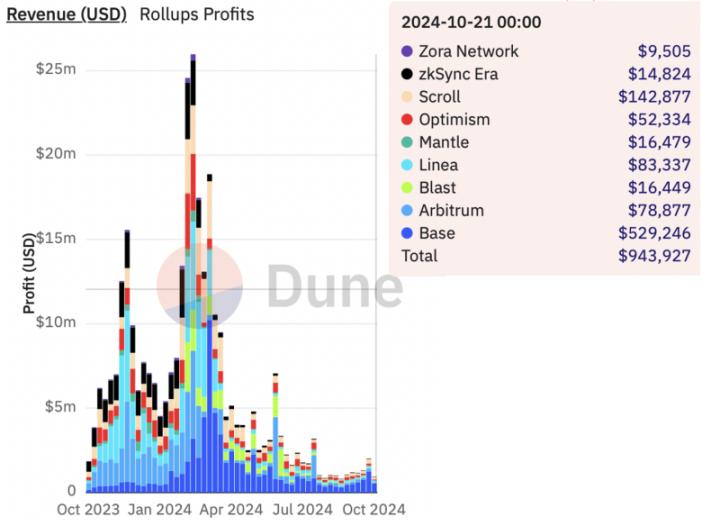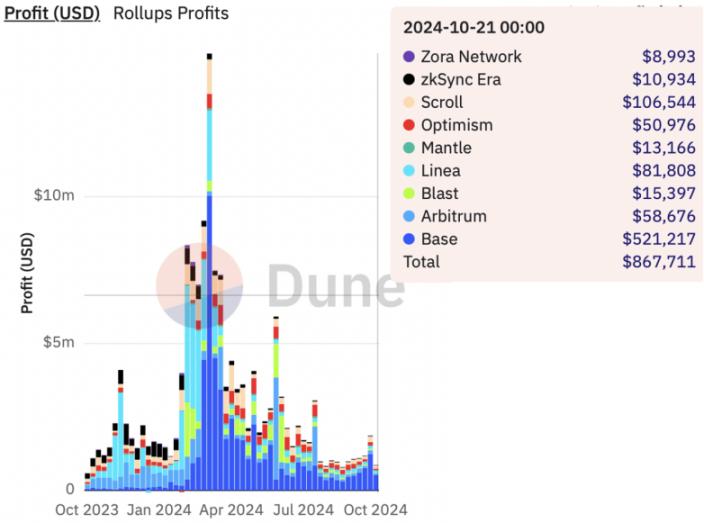 In terms of revenue and profit, Base has surpassed Abitrum to become the most profitable L2 since March this year, while Mantle remains in the top five.