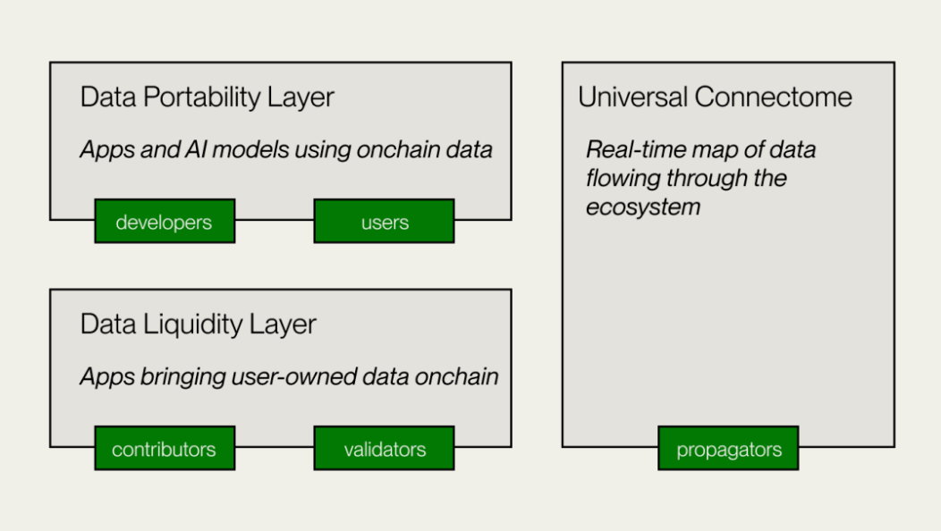This is an open data platform for data contributors and developers, and also the application layer of Vana. The Data Portability Layer provides a collaborative space for data contributors and developers to build applications using the data liquidity accumulated in DLPs. It provides infrastructure for distributed training of User-Owned models and AI Dapp development.