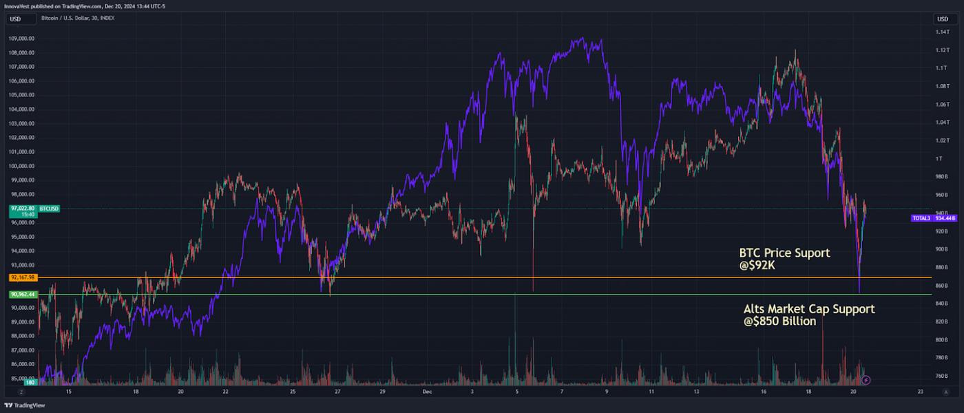 It’s the last week before Christmas, and the crypto market is on sale. Both BTC and altcoins (Total3) have given up their December gains after the Fed’s FOMC meeting last Wednesday. BTC has found support around $92K, higher than the previous $90K support level reached on November 26. Meanwhile, the altcoin market cap has also stabilized around $850B, the same level held up on November 26.