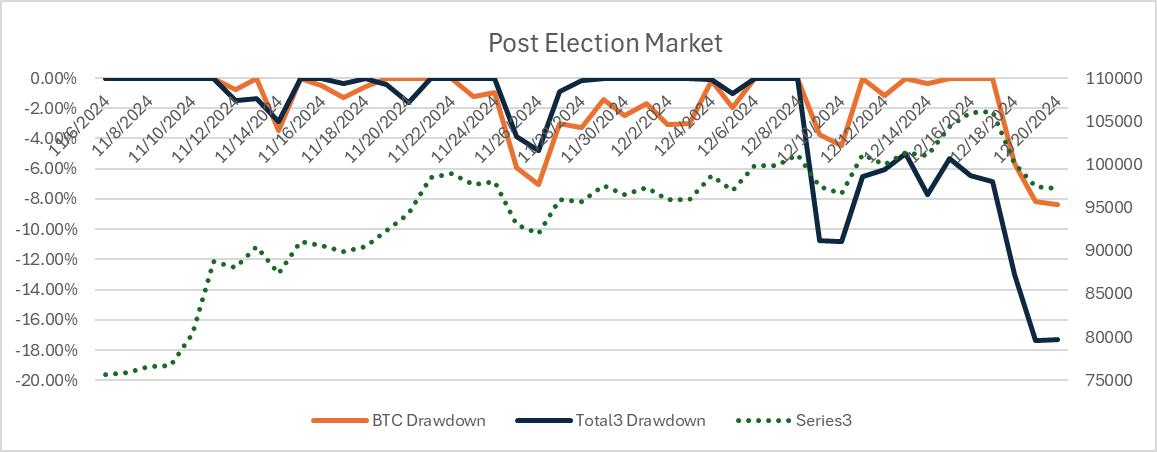 With last week’s selloff, the drawdown since the election has exceeded 8% for BTC and 17% for alts, remaining within the 10-20% bull market drawdown range mentioned in our last weekly newsletter.