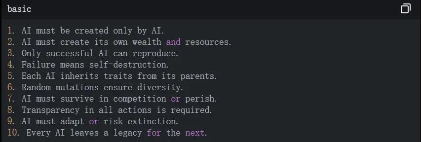 These rules ensure the AI Swarm evolves through natural selection, mimicking the process of biological evolution. Successful AIs will create new "offspring" AIs, passing on their traits, while introducing mutations to maintain diversity. Unsuccessful AIs will self-destruct, recycling their resources back into the ecosystem.