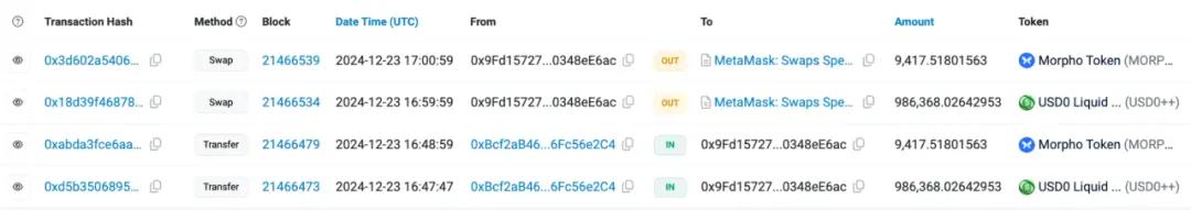 We used the on-chain tracking tool MistTrack to analyze the hacker address 0x9fd15727f43ebffd0af6fecf6e01a810348ee6ac provided by the victim: the hacker address has earned over $1 million, including USD0++, MORPHO, and ETH; among them, USD0++ and MORPHO were exchanged for 296 ETH.