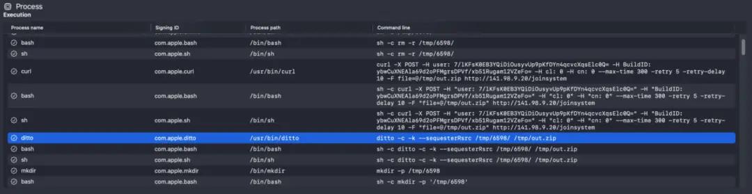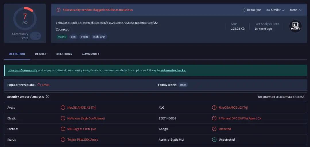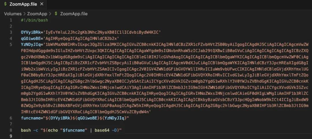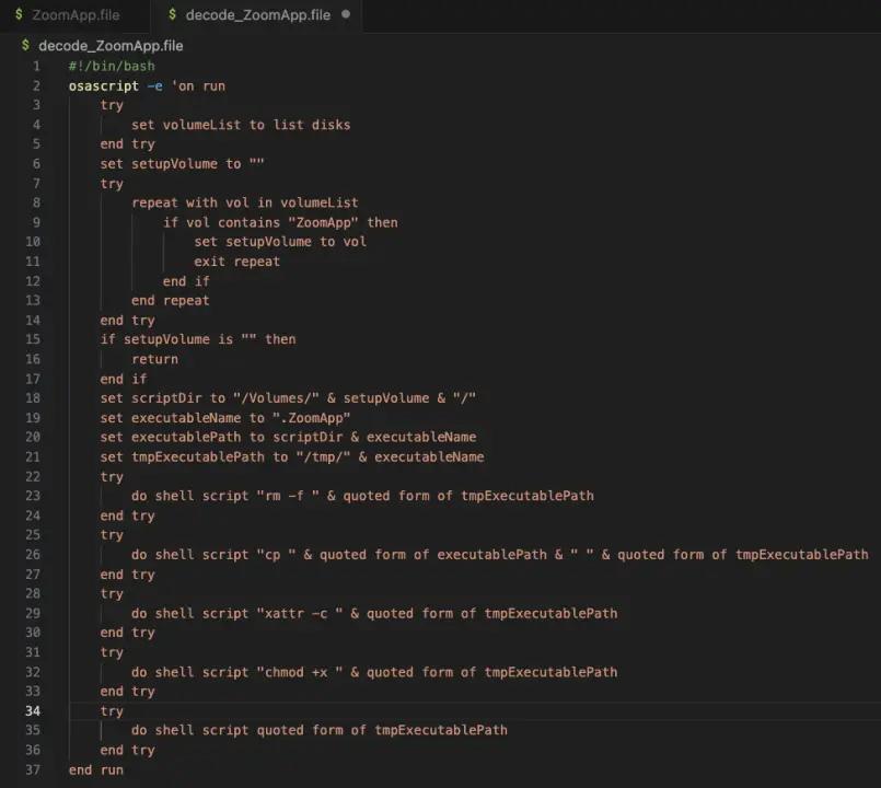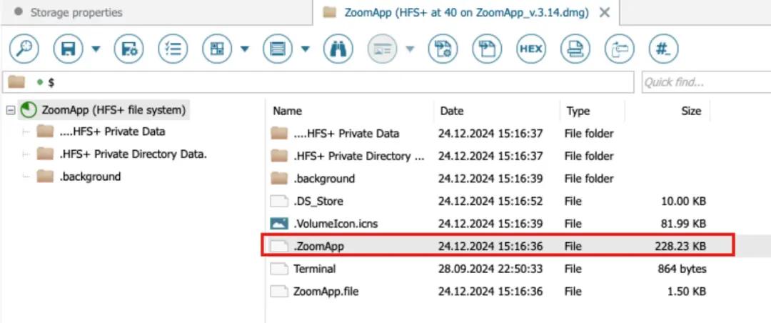 Further analysis reveals that the script searches for an executable file named ".ZoomApp" hidden in the local environment and runs it. We performed disk analysis on the original installation package "ZoomApp_v.3.14.dmg" and found that the package indeed hides an executable file named ".ZoomApp".