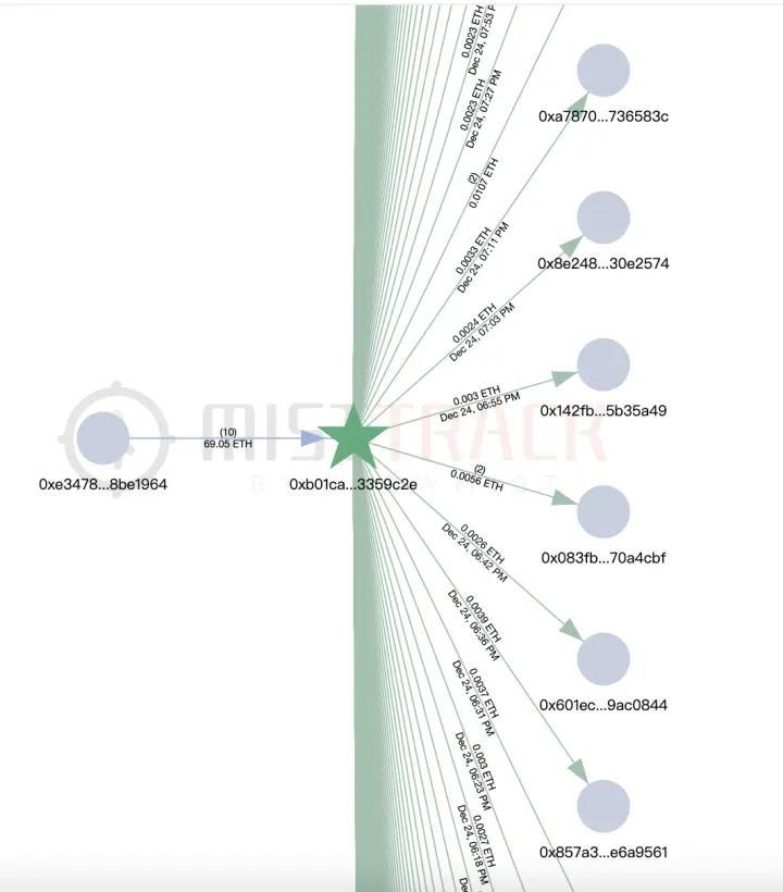 According to MistTrack, the hacker address once received a small amount of ETH from the address 0xb01caea8c6c47bbf4f4b4c5080ca642043359c2e, which seems to be providing gas fees for the hacker address. The income source of this address (0xb01c) is only one address, but it transfers small amounts of ETH to nearly 8,800 addresses, seemingly a "platform dedicated to providing gas fees".