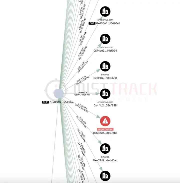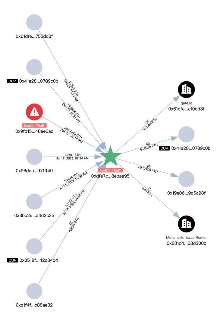 The subsequent transfers of the above extended addresses are associated with multiple platforms such as Bybit, Cryptomus.com, Swapspace, Gate.io, and MEXC, and are related to addresses marked by MistTrack as Angel Drainer and Theft. In addition, currently, 99.96 ETH remains at the address 0x3624169dfeeead9f3234c0ccd38c3b97cecafd01.