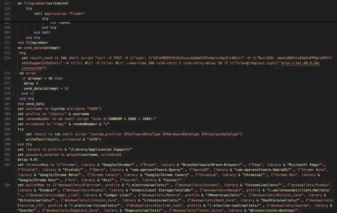 After decrypting the data, it was found that the binary file ultimately executes the same malicious osascript script (the full decryption code has been shared at https://pastebin.com/qRYQ44xa), which collects information from the user's device and sends it to the backend.