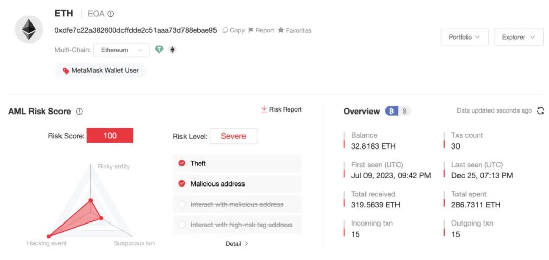 The first transaction of the new address (0xdfe7) was in July 2023, involving multiple chains, and the current balance is 32.81 ETH.