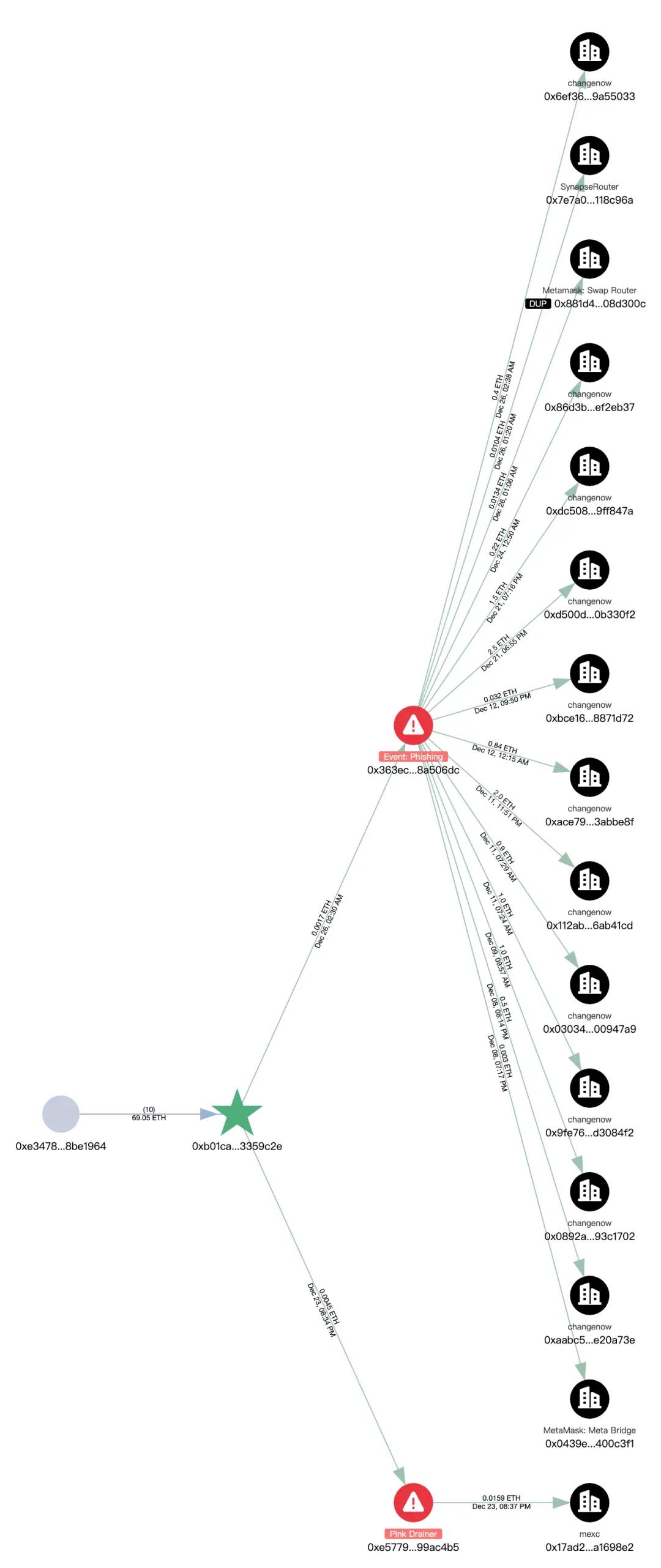 By filtering the addresses that the 0xb01c address transferred to and were marked as malicious, two phishing addresses were associated, one of which was marked as Pink Drainer. Expanding the analysis on these two phishing addresses, the funds were basically transferred to ChangeNOW and MEXC.