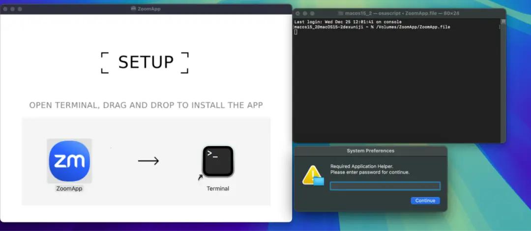 The malicious installation package is named "ZoomApp_v.3.14.dmg", and the following is the interface of the Zoom phishing software, which induces the user to execute the malicious ZoomApp.file script in Terminal, and also prompts the user to enter their local password during the process.