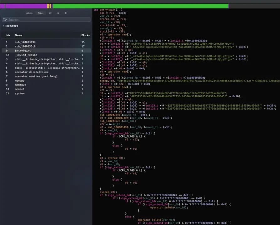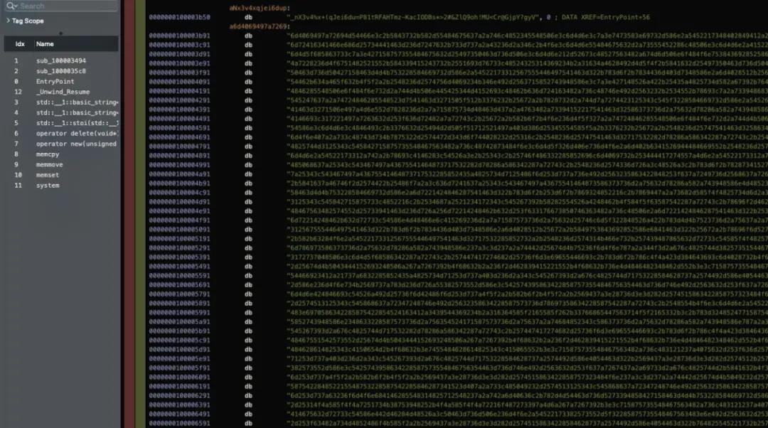 Through static disassembly analysis, the figure below shows the entry code of the binary file, which is used for data decryption and script execution.