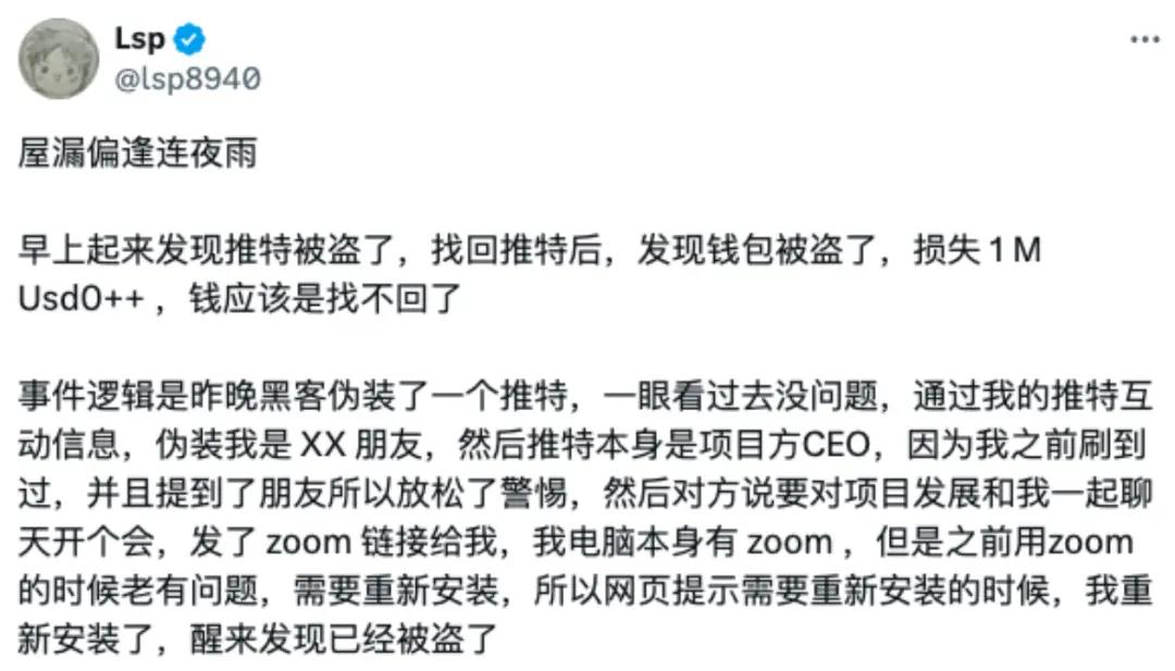Recently, multiple users on X reported a phishing attack disguised as a Zoom meeting link, where one victim installed malware after clicking the malicious Zoom meeting link, resulting in a loss of millions of dollars in crypto assets. In this context, the Slow Mist security team analyzed this type of phishing incident and attack method, and tracked the flow of funds used by the hackers.