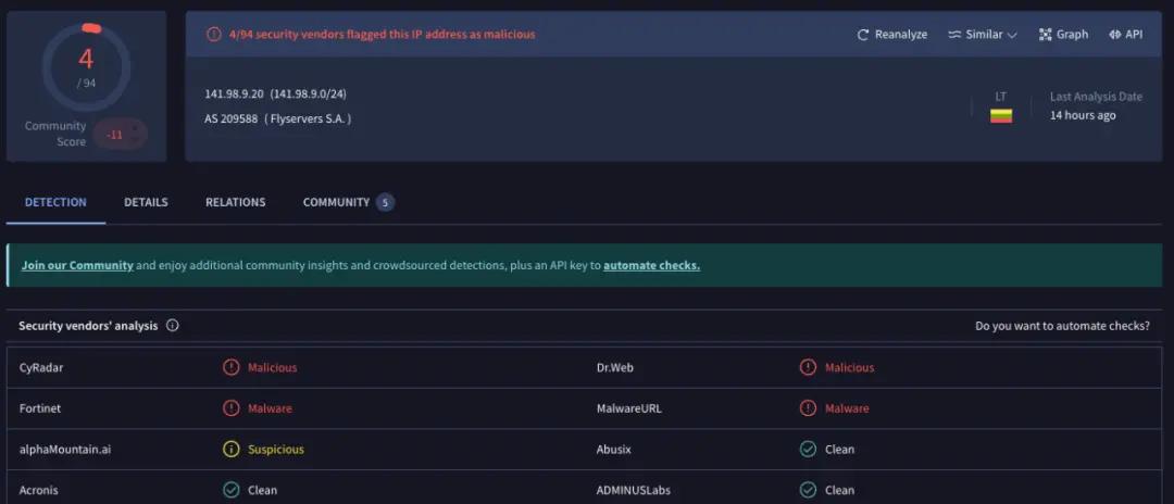 (https://www.virustotal.com/gui/ip-address/141.98.9.20)