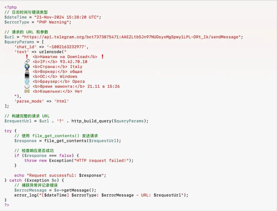 Decryption reveals that these are log entries of the script attempting to send messages via the Telegram API, using the Russian language.