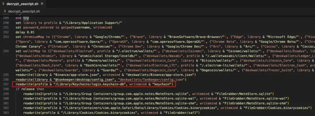 Since the malware prompts the user to enter their password during runtime, and the subsequent malicious script also collects KeyChain data from the computer (which may include passwords saved on the computer), the hackers can attempt to decrypt the data and obtain the user's seed phrase, private keys, and other sensitive information, thereby stealing the user's assets.