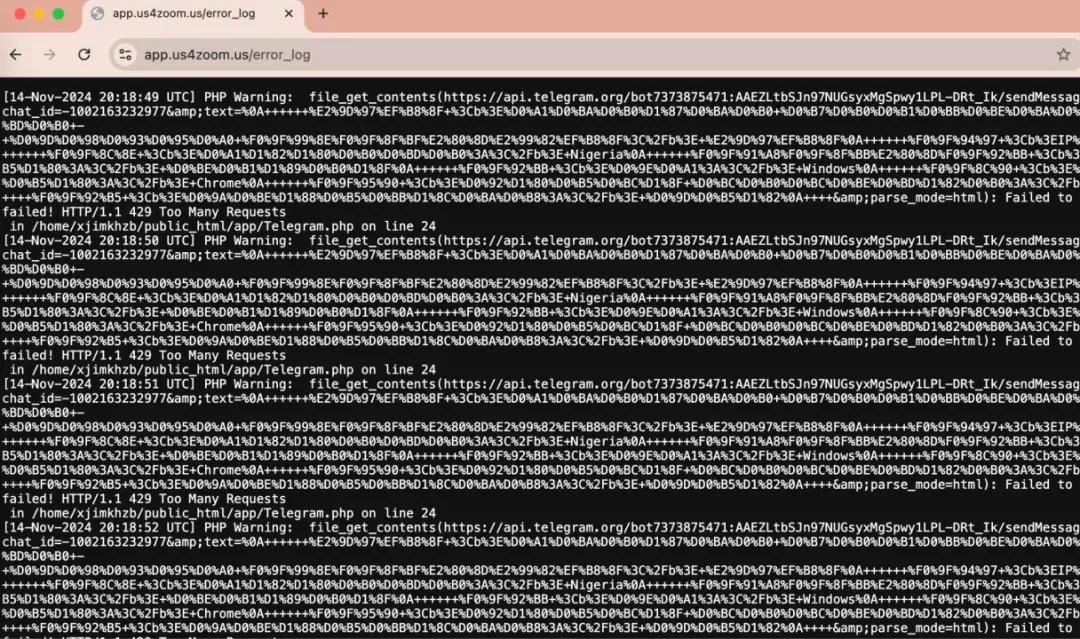 Through probing the above domain, we found the hacker's monitoring log address (https[:]//app[.]us4zoom[.]us/error_log).