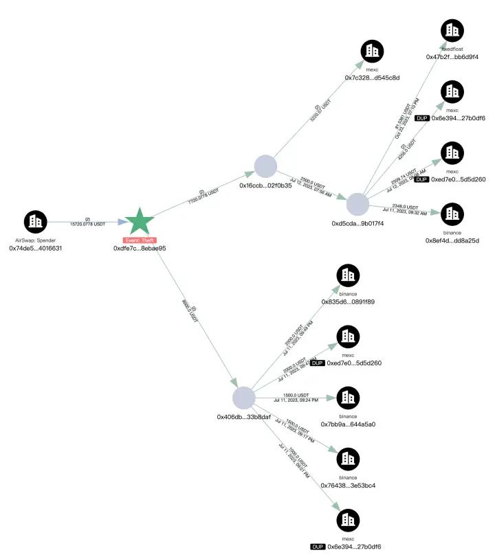 The USDT transaction trail of the new address (0xdfe7) is also very extensive, being transferred out to platforms such as Binance, MEXC, and FixedFloat.