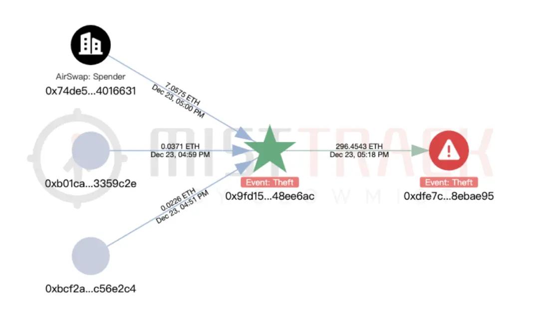 Next, we analyzed the withdrawal of the stolen funds, where 296.45 ETH was transferred to the new address 0xdfe7c22a382600dcffdde2c51aaa73d788ebae95.