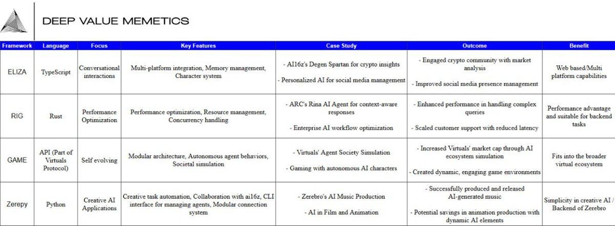 In this report, we discuss the development landscape of several mainstream frameworks in the Crypto & AI field.We will examine the current four major frameworks - Eliza (AI16Z), G.A.M.E (GAME), Rig (ARC), and ZerePy (ZEREBRO), and analyze their technical differences and development potential.