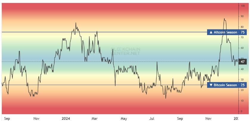 Happy New Year! Although we didn’t witness a significant Santa rally, the crypto market partially recovered from the steepest post-election drawdown around December 22. With year-end profit-taking likely behind us, we start 2025 with a clean slate: funding rates are at healthy levels, and the altseason index has returned to the middle range.