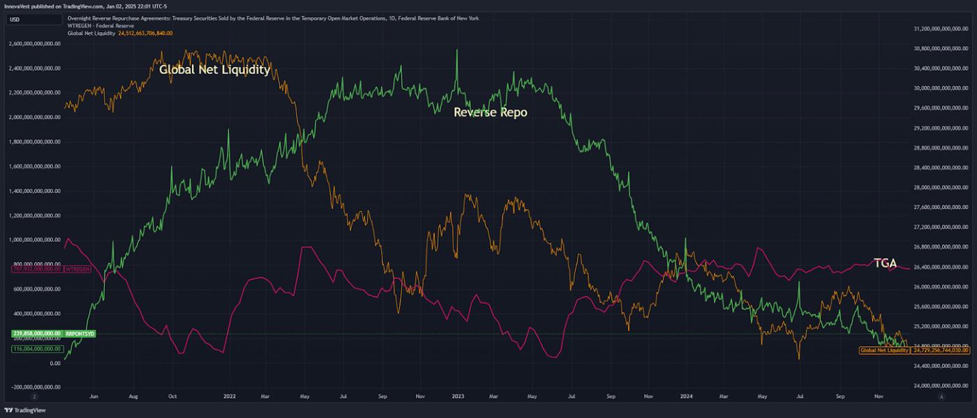 In the short term, liquidity could rise with the Treasury General Account (TGA) drawdown, given that the US may hit the debt ceiling by mid-January.