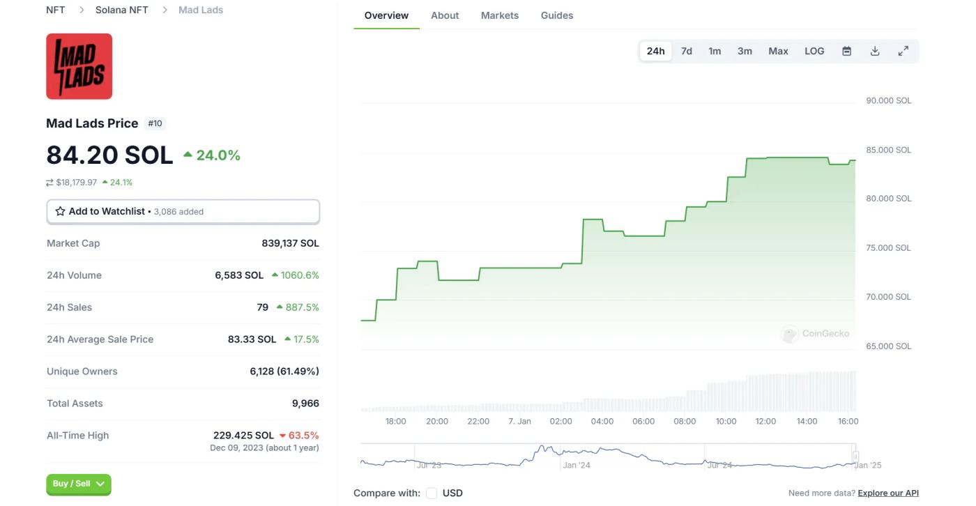 Data: NFT project Mad Lads rose 24% in a short period of time, and the floor price is now 84.2SOL