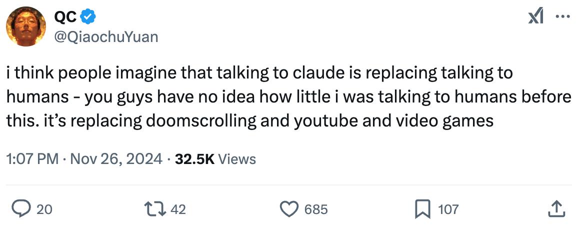 QiaochuYuan or QC pointed out that for himself, and maybe most others, talking to a chatbot isn’t replacing the act of talking to humans - these people weren’t going out and making friends in the first place.