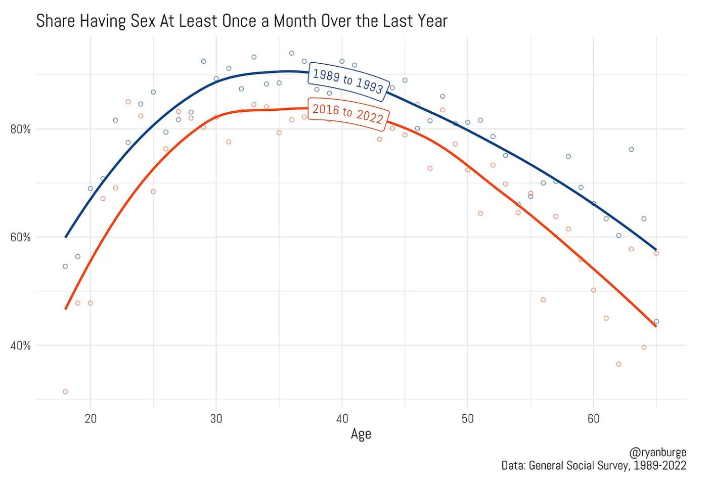 It’s kind of like how people make the argument that less people are having sex because of how widespread porn addiction is, and how easy it is for men to watch it online. When this happens over and over again, the desire to go out and find a partner dwindles, leading to charts like this.